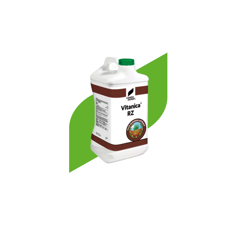 El fertilizante líquido Vitanica® RZ es un producto a base de extractos de algas marinas con fitohormonas que promueve la vitalidad de las plantas y el crecimiento de las raíces.