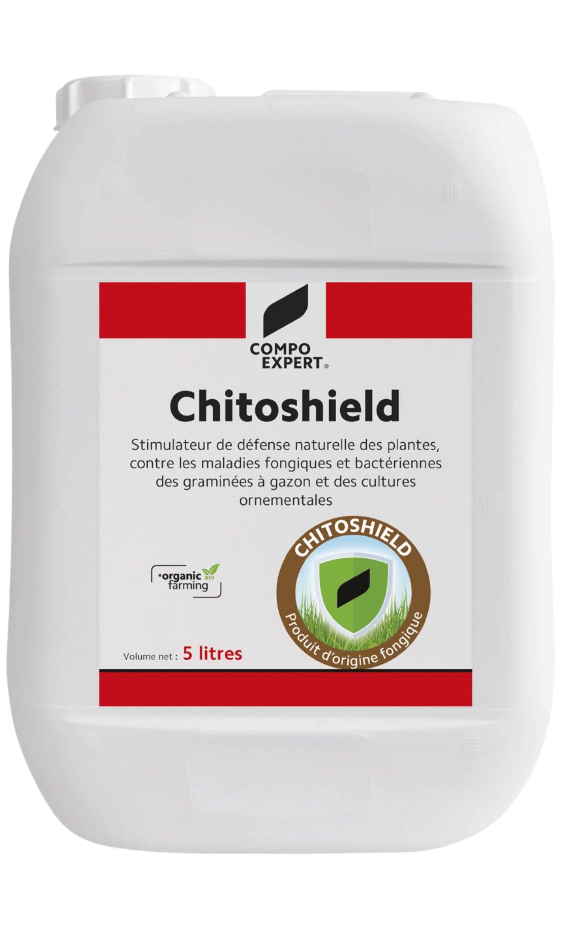 Chitoshield est un produit de biocontrôle, contenant un chitosane d’origine fongique, seul chitosane approuvé sur gazon. Chitoshield est une substance de base agissant de manière préventive sur les maladies fongiques et bactériennes du gazon et cultures ornementales. Chitoshield est un stimulateur des défenses naturelles des plantes (SDP). En reconnaissant le chitosane appliqué par pulvérisation, la plante déclenche un ensemble de mécanismes de défense lui permettant de se préparer à lutter contre les agents pathogènes, avant même leur apparition. En complément de cette action, Chitoshield possède également des propriétés filmogènes : le chitosane forme une barrière protectrice à la surface du végétal, limitant ainsi l'installation et le développement des phytopathogènes. Chitoshield est utilisable en agriculture biologique conformément à la réglementation en vigueur.